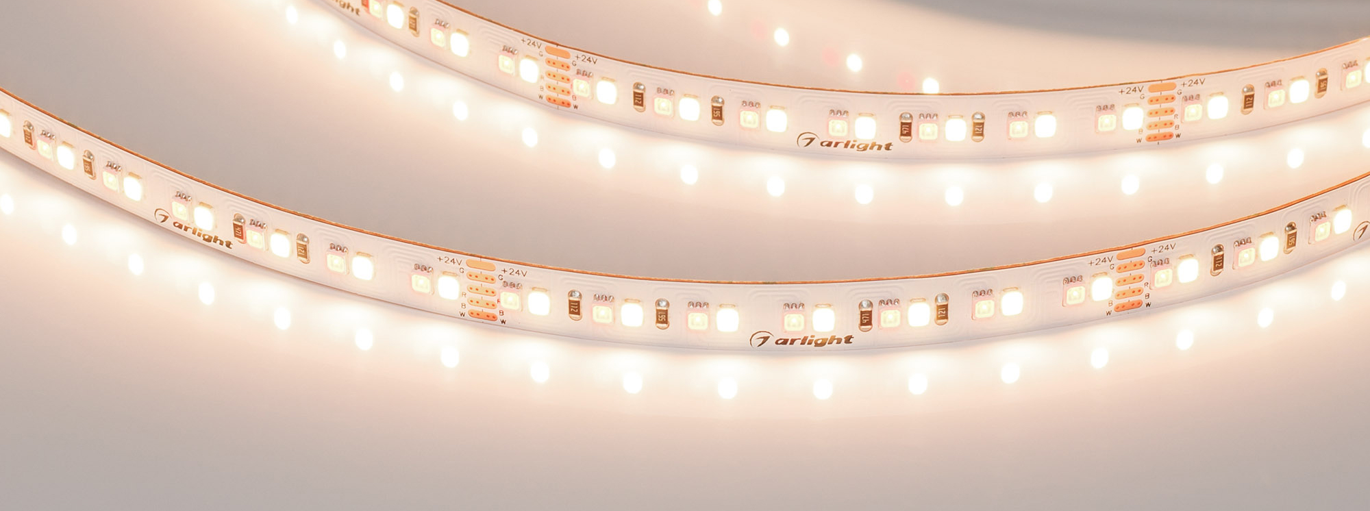 Светодиодная высокоэффективная мультицветная лента RT серии A168 шириной 10 мм, мощностью 20 Вт/м. Напряжение питания 24 В. Эффективность белого канала 150 лм/Вт. Светодиоды SMD 2835, 120 шт/м, дневного цвета свечения (4000K). Высокий индекс цветопередачи CRI>90 обеспечивает точное восприятие цветов и оттенков при освещении любых жилых и производственных помещений. Высокая эффективность белого канала позволяет применять ленту для основного и декоративного освещения. Четырехканальная лента с пятью проводами для подключения, управление с помощью RGBW-контроллера. Для обеспечения теплоотвода обязательна установка на алюминиевый профиль.