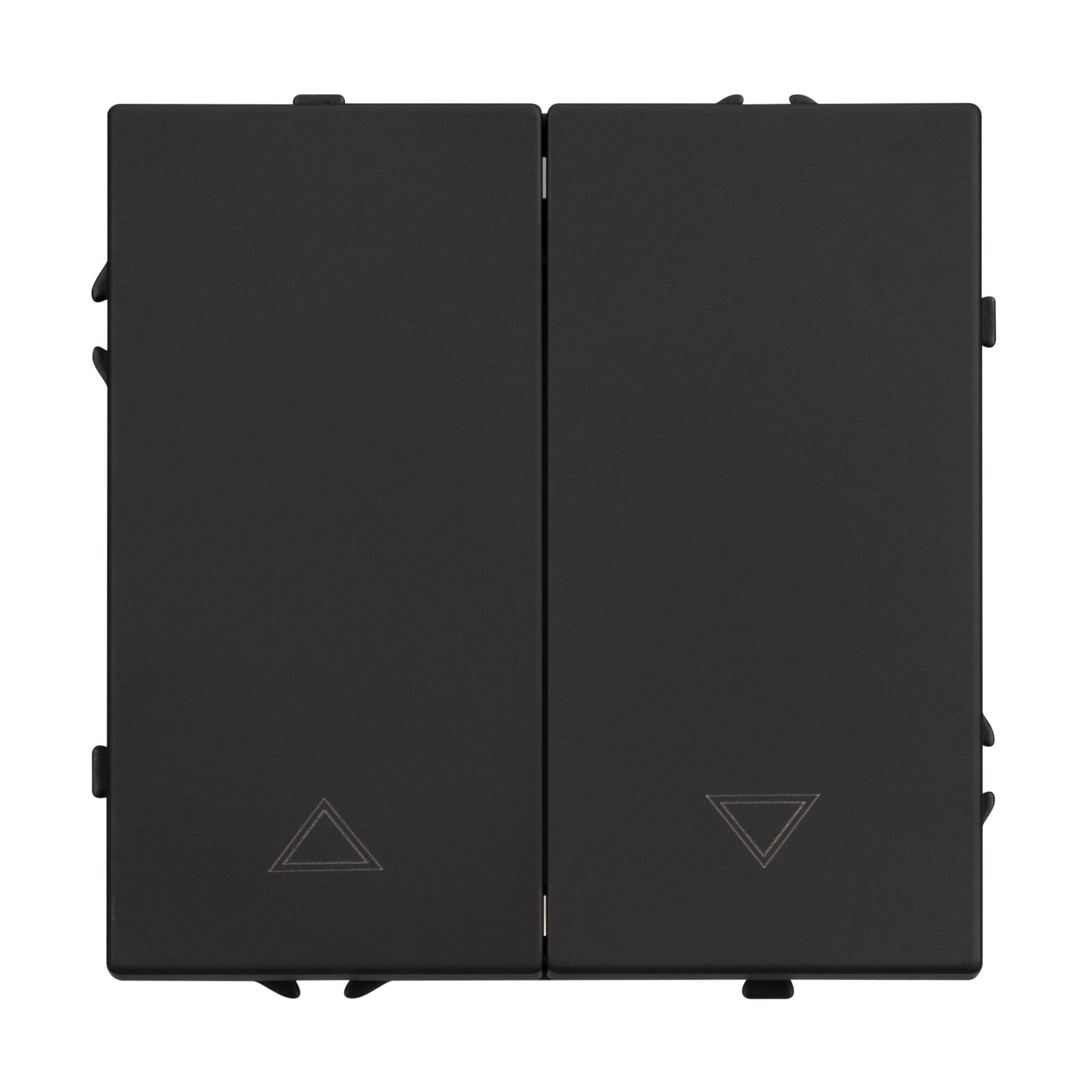 Механизм выключателя управления шторами на 1 пост 2 перекидные клавиши. Цвет - черный, с Soft-Touch покрытием. Без фронтальной рамки. Уровень пылевлагозащиты IP20. Выключатель устанавливается в стандартный круглый подрозетник круглого сечения диаметром 60мм.