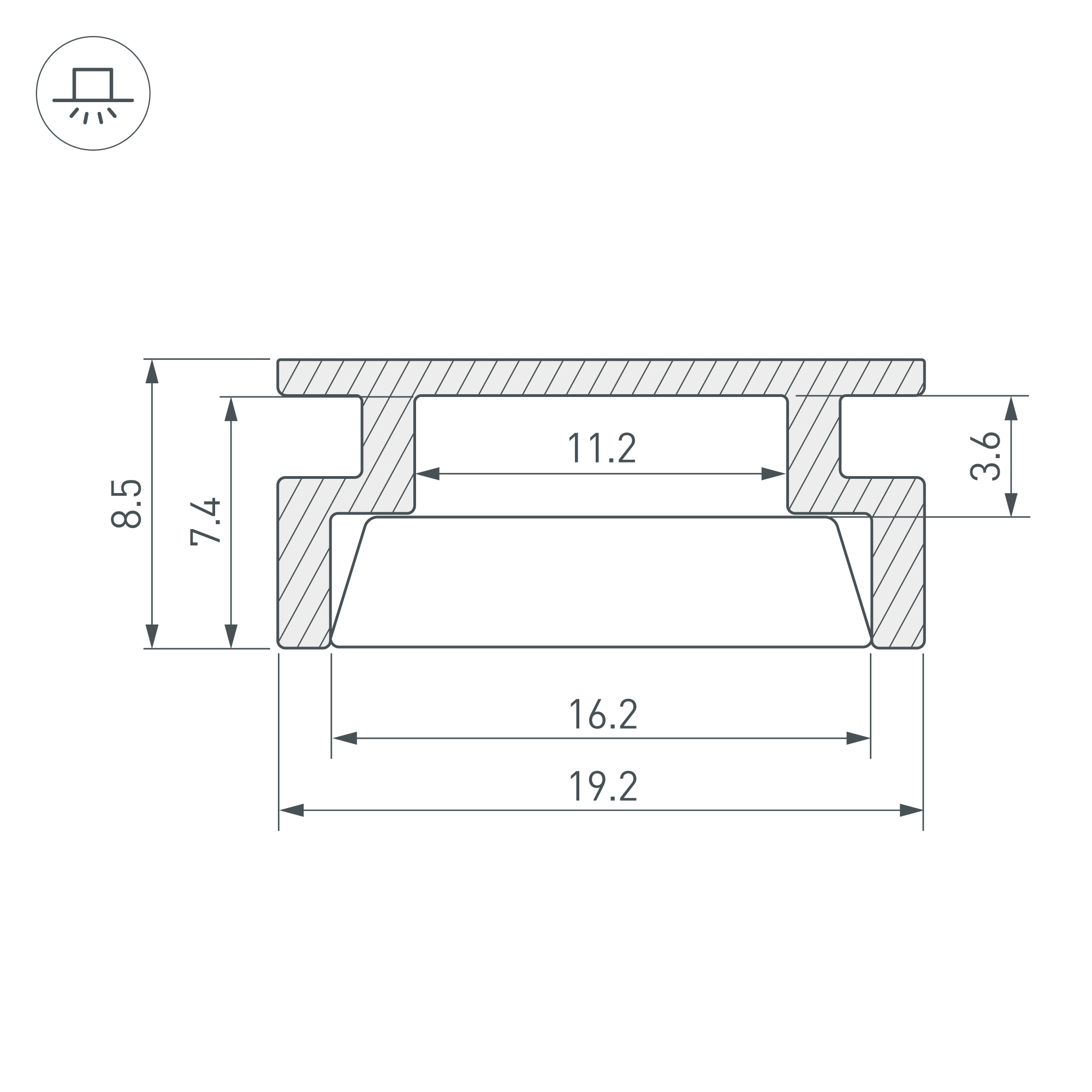 Алюминиевый профиль, встраиваемый в пол. Высокопрочный алюминий (неанодированный). Герметизация до IP67. Для использования внутри помещений. Габаритные размеры (L×W×H): 2000x19,2x8,5 мм. Ширина площадки для ленты 11,2 мм. Экран (из сверхпрочного поликарбоната, УФ-устойчивый), заглушки и другие аксессуары приобретаются отдельно. Цена за 1 метр.