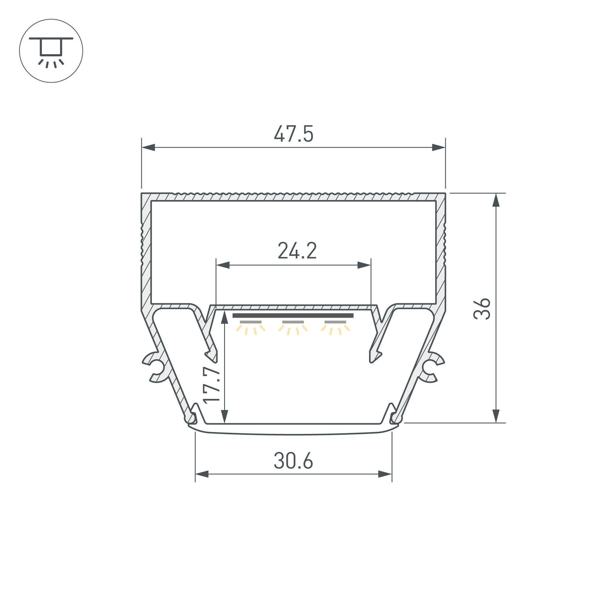 Встраиваемый алюминиевый профиль (центральная линия) для дизайнерских решений «линии света» в натяжных потолках. Решение 2-в-1: служит каркасом для крепления натяжного потолка и профилем для установки светодиодной ленты. Габаритные размеры профиля составляют 2000 мм в длину, 47,5 мм в ширину и 36 мм в высоту. Площадка для установки светодиодных лент позволяет использовать ленту шириной до 24,2 мм и мощностью до 54 Вт/м. Это обеспечивает гибкость в выборе светодиодных лент и создает потрясающие световые решения. Экран, заглушки и другие аксессуары не включены в комплект и приобретаются отдельно. Цена указана за 1 метр профиля. Отличное решение для создания современных световых проектов.