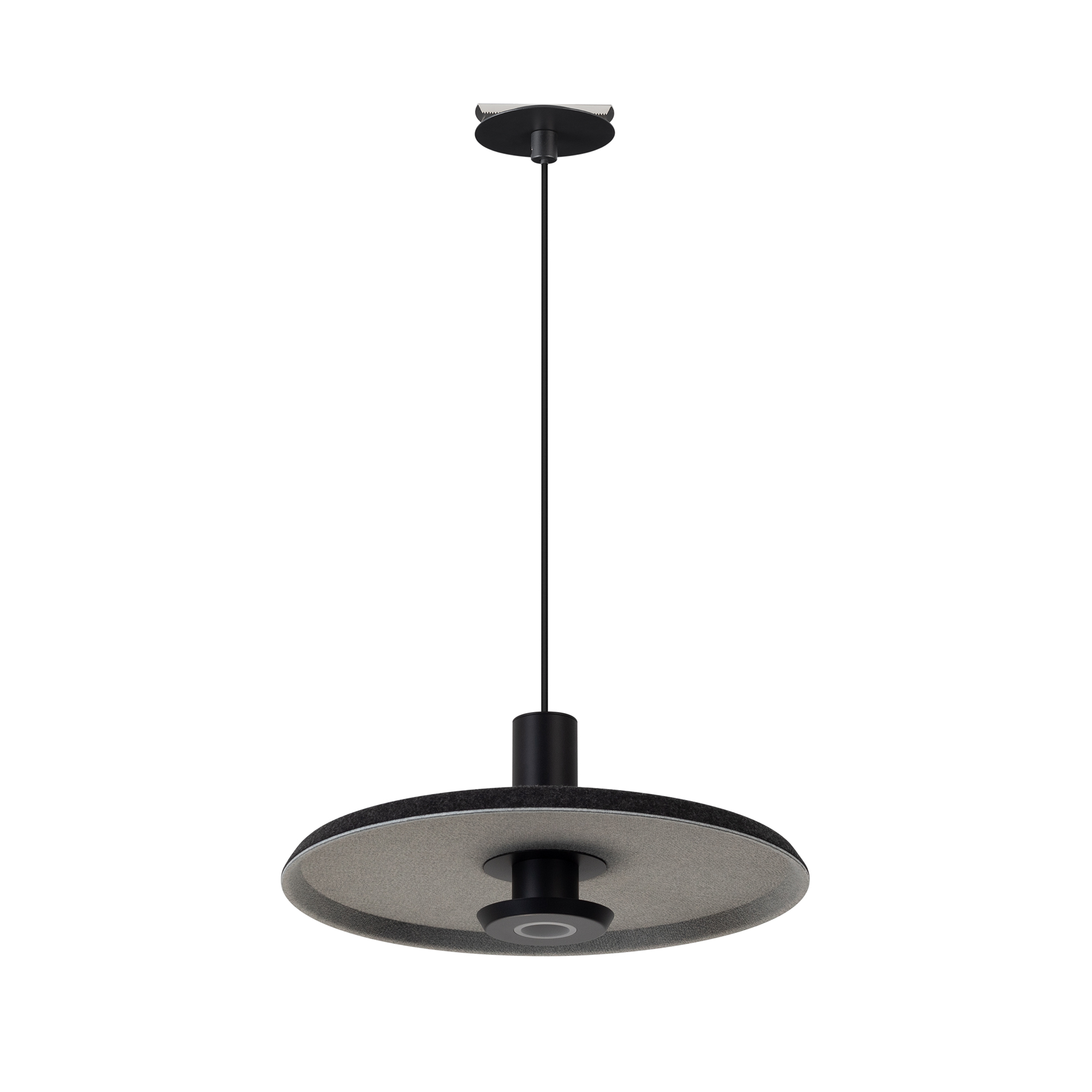 Подвесной светильник. Мощность 12 Вт, св. поток 708 лм, 59 лм/Вт, теплый 3000 K, CRI>94, угол 36°, напряжение питания 230 В. Темно-серый фигурный корпус из переработанного фетра с светло-серой внутренней поверхностью, линза-рассеиватель из PMMA, степень защиты IP20. Размер: диаметр 350 мм, высота 145 мм. Монтаж подвесной, длина подвеса 2000 мм, регулируемая. В комплекте 2 вида чаш. Габариты чаши (встраиваемая) Ø80 х 23 мм, врезное отверстие Ø60 мм. Габариты чаши (накладная) Ø120 x 35 мм. Драйвер 59 В, 300 мА, пульсация <1%. Управление по TRIAC.